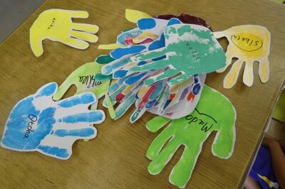 係ごとに集まって、これからの活動計画を立てていました。また、同時進行で 、学級スローガンのポスターと、ポスターに貼るカラー手形を作っていました。