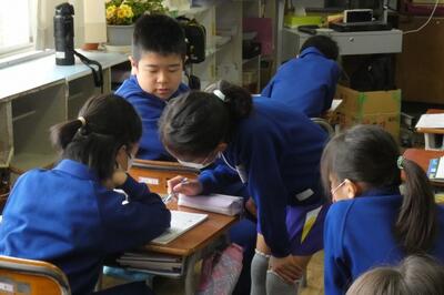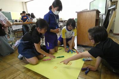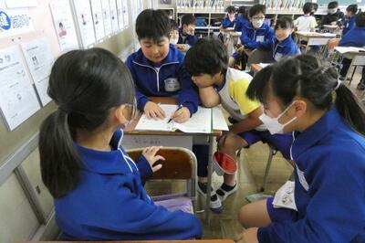 いろいろとアイディアを出し合いながら、掲示用の学級スローガンを作成する子供たち。