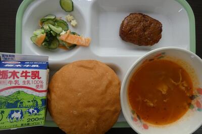 今日の給食は、セルフ照り焼きチキンバーガー、チーズと野菜のサラダ、県産トマトスープ、丸パン、牛乳でした。エネルギー614kcal、たんぱく質26.5g、脂質25.4gでした。ごちそうさまでした。