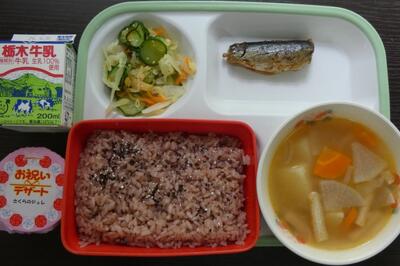 今日は「入学・進学お祝い給食」でした。いわしのごまみそ煮、たくあんあえ、吉野汁、お祝いデザート、赤飯・ごま塩、牛乳をいただきました。エネルギー634kcal、たんぱく質24.2g、脂質17.9gでした。ごちそうさまでした。