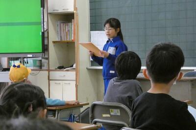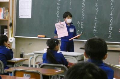 今朝、児童会運営委員の皆さんが各学級を回り、創立50周年記念イメージキャラクター募集のPRを行いました。写真は1年生教室です。