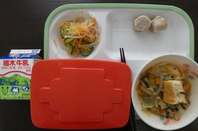 今日の給食は、しゅうまい、春雨サラダ、豚肉とキャベツのみそ炒め、ごはん、牛乳でした。エネルギー659kcal、たんぱく質25.5g、脂質21.7gでした。ごちそうさまでした。