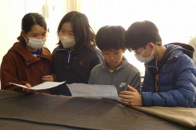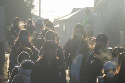朝の陽射しを背に、白い息を吐きながら登校する子供たち。大谷台方面です。