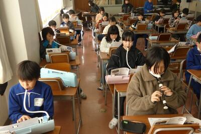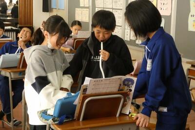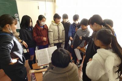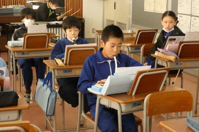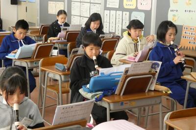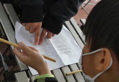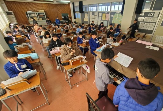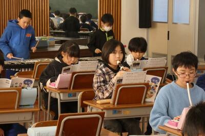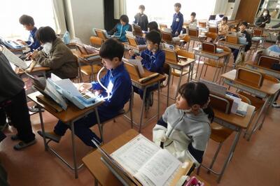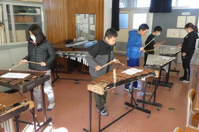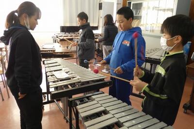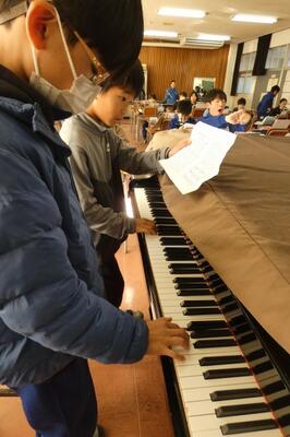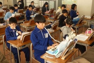 使う楽器は、鍵盤ハーモニカ、ソプラノリコーダー、木琴、鉄琴、ピアノです。楽譜にあるスタッカートや休符に気を付けながら、自主練習に励む子供たち。