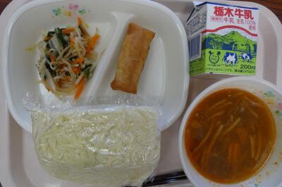 今日の給食は、春巻、にらともやしのあえもの、マーボーラーメン、牛乳でした。エネルギー706kcal、たんぱく質25.0g、脂質24.9gでした。ごちそうさまでした。