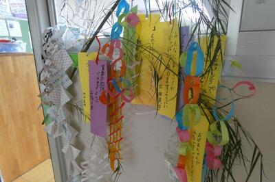 校舎内を歩いていたら、七夕飾りを発見しました。短冊に書いてある願い事をこっそり読ませてもらったら、心ほかほか、とてもうれしい気持ちになりました。