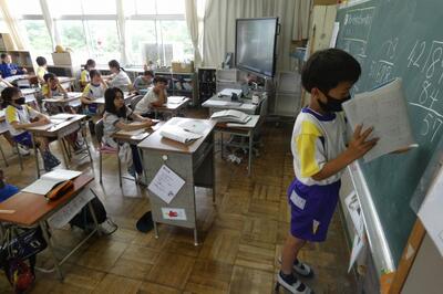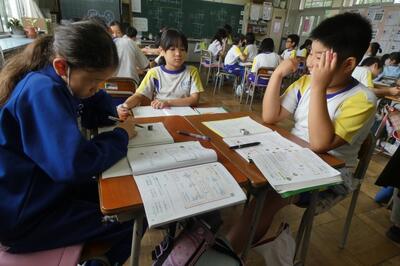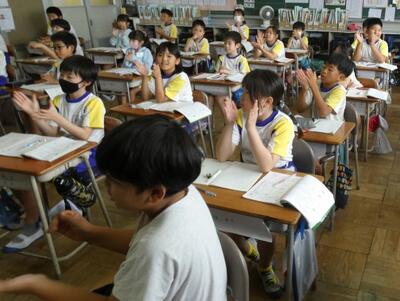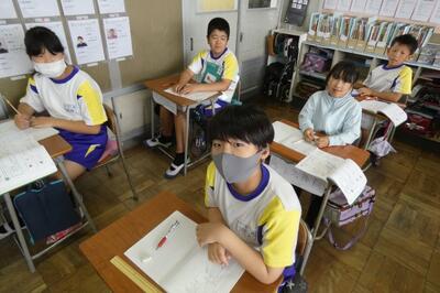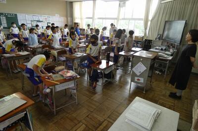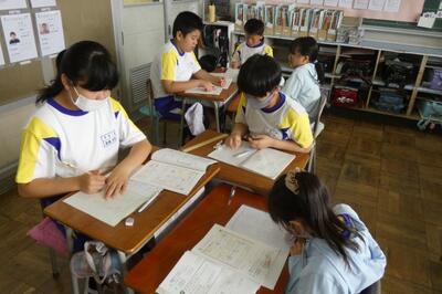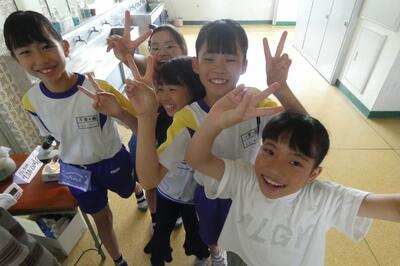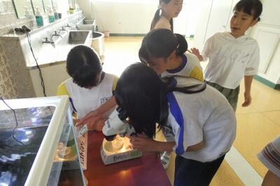 ここは、5年4組前の廊下の一角です。メダカやエビを飼っている大きな水槽の隣に、メダカの赤ちゃん観察コーナーが設けられています。顕微鏡を覗いている5年生です。