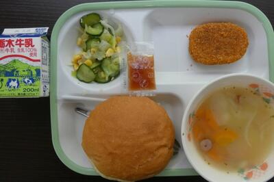 今日の給食は、焼き牛肉コロッケ・ソース、イタリアンサラダ、パスタスープ、丸パン、牛乳でした。エネルギー613kcal、たんぱく質19.2g、脂質22.6gでした。ごちそうさまでした。