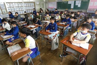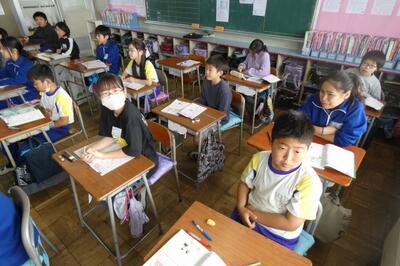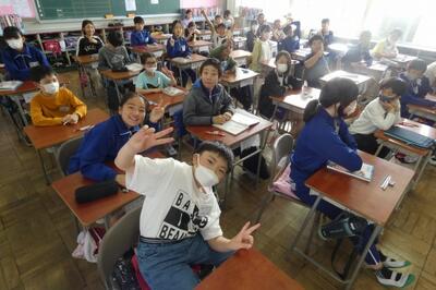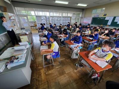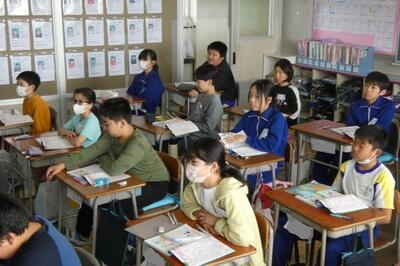 前回行ったテストの振り返りを行った後、新しい単元の学習に向けて、問題解決や説明の道具として大切な比例数直線(2本の数直線を組み合わせて表したもの)について、かき方や使い方をみんなで確認していました。