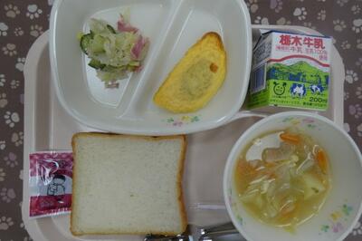 今日の給食は、ミートオムレツ、ハムと野菜のマリネ、ポトフ、食パン、チョコ大豆、牛乳でした。エネルギー675kcal、たんぱく質26.1g、脂質29.8gでした。ごちそうさまでした。
