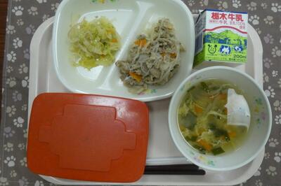今日は、地産地消給食でした。豚丼、ごま酢和え、にらのかき卵汁、ごはん、牛乳をいただきました。エネルギー619kcal、たんぱく質24.0g、脂質21.5gでした。ごちそうさまでした。