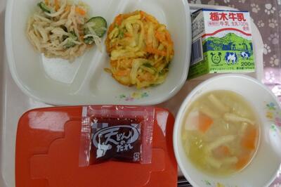 今日の給食は、野菜かき揚げ・天丼のたれ、切干大根のごま酢あえ、白菜のみそ汁、ごはん、牛乳でした。エネルギー737kcal、たんぱく質18.4g、脂質30.2gでした。ごちそうさまでした。