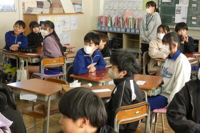 テーマは「言葉の力、言葉の重み」で、各学級担任と児童指導主任がティームティーチングで授業を行いました。