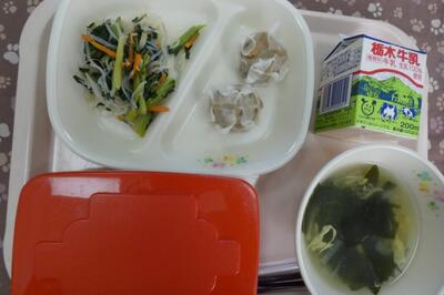 今日は、地産地消給食でした。肉しゅうまい、もやしと青菜のナムル、卵とわかめのスープ、ごはん、牛乳をいただきました。エネルギー642kcal、たんぱく質23.5g、脂質21.8gでした。ごちそうさまでした。