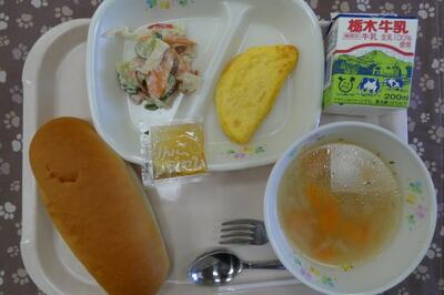 今日の給食は、プレーンオムレツ、かんぴょうサラダ、アルファベットスープ、ミルクコッペパン、りんごジャム、牛乳でした。エネルギー651kcal、たんぱく質22.4g、脂質25.0gでした。ごちそうさまでした。