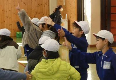 第1日午前のプログラム「ふれあい活動」に向かう子供たち。ハイ、ポーズ!