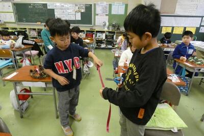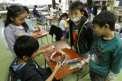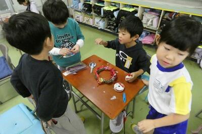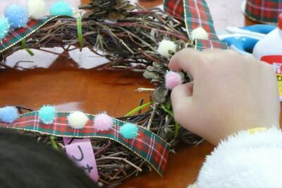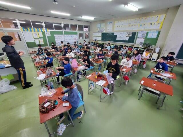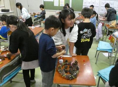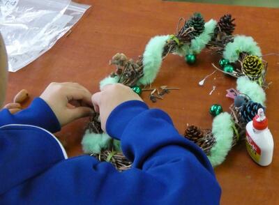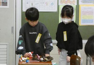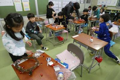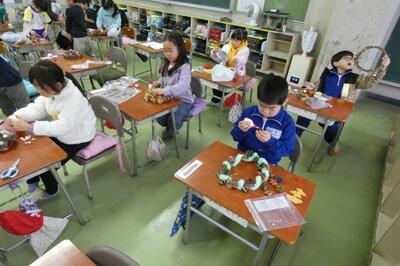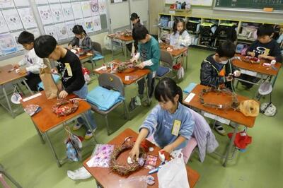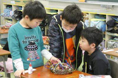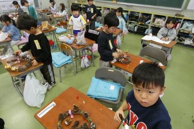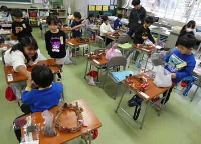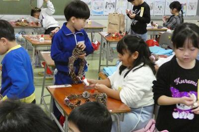 先日、1年生は自分で育てたアサガオのつるを束ねて、リースを作りました。今日はそのリースに飾りを付けて、オリジナルのクリスマスリースを作りました。