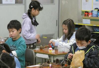 用意した松ぼっくりにボンドを付けてリースに固定します。ボンドが乾くまで待っているのが大変そうでした。