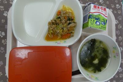 今日の給食は、野菜入り焼き肉、えびボール入りわかめスープ、ごはん、牛乳でした。エネルギー621kcal、たんぱく質24.9g、脂質21.2gでした。ごちそうさまでした。