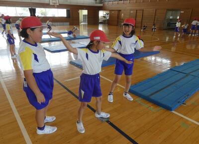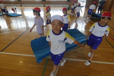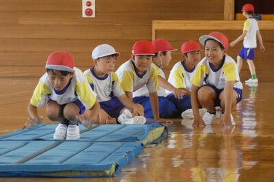 大きな声で準備体操とあいさつをした後、グループに分かれてまずはマットの上を一人ずつジャンプ。