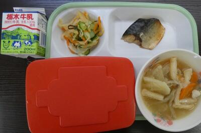 今日の給食は、さばの青じそ西京焼き、たくあんあえ、根菜のごま汁、ごはん、牛乳でした。エネルギー609kcal、たんぱく質24.7g、脂質20.6gでした。ごちそうさまでした。