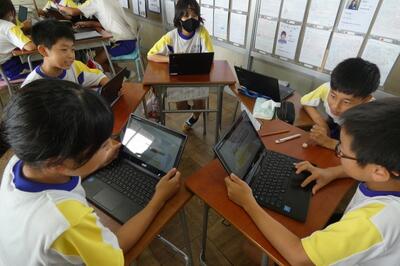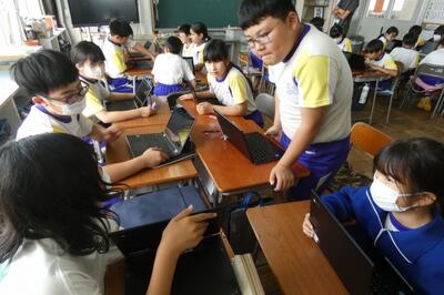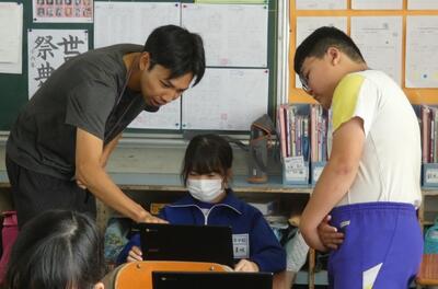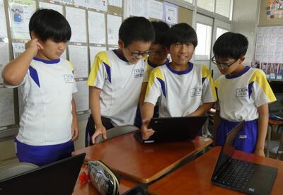 自グループを離れて、端末上の友達の意見を覗く子供たち。