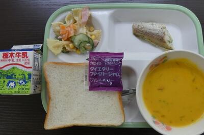 今日の給食は、タラのバジルソース焼き、ファルふぁーれのサラダ、かぼちゃのポタージュ、食パン、ブルーベリージャム、牛乳でした。エネルギー649kcal、たんぱく質28.6g、脂質20.6gでした。ごちそうさまでした。