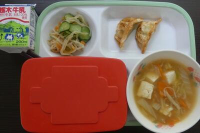 今日の給食は、揚げぎょうざの甘酢かけ、もやしのナムル、旨辛キムチスープ、ごはん、牛乳でした。エネルギー603kcal、たんぱく質19.7g、脂質20.4gでした。ごちそうさまでした。