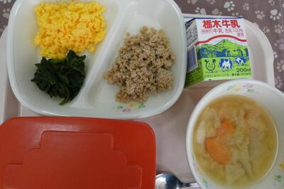 今日は、三色ごはん(鶏そぼろ・卵そぼろ・ほうれん草)、豆乳仕立ての野菜汁、牛乳をいただきました。エネルギー595kcal、たんぱく質27.4g、脂質17.5gをいただきました。ごちそうさまでした。