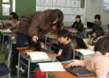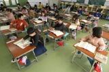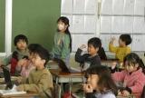 2年生が掛け算九九をマスターしようと頑張っています。職員室で教頭から暗唱の合格スタンプを押してもらう2年生。