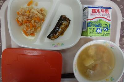 今日は、初午(はつうま)給食でした。いわしの生姜煮、しもつかれ、こしね汁、ごはん、牛乳でした。エネルギー614kcal、たんぱく質28.6g、脂質20.0gでした。ごちそうさまでした。