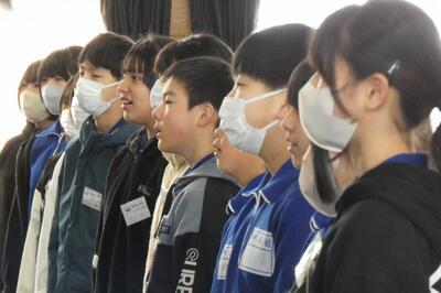 向かい合ってお互いにあいさつをする5年生と6年生。