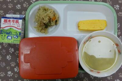 今日の給食は、厚焼きたまご、切干大根の煮物、野菜のごま汁、ごはん、牛乳でした。エネルギー608kcal、たんぱく質22.3g、脂質19.1gでした。ごちそうさまでした。