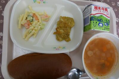 今日の給食は、タンドリーチキン、マカロニサラダ、ミネストローネスープ、黒糖コッペパン、牛乳でした。エネルギー618kcal、たんぱく質26.4g、脂質21.9gでした。ごちそうさまでした。