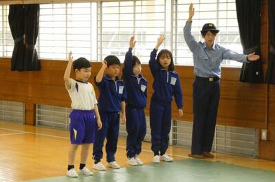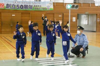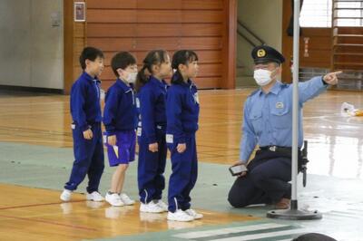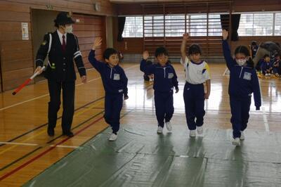 1・2年生を対象に、交通安全教室を行いました。真岡警察署のお巡りさんや交通指導員さんが講師を務め、道路の横断の仕方や雨天時の安全な歩き方などを子供たちに教えてくださいました。写真は、2年1・2組の様子です。