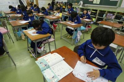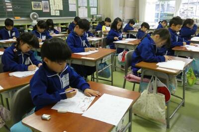 先生と一緒に空書き(そらがき)をした後、子供たちは鉛筆で一文字ずつ丁寧に書いていました。