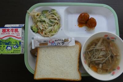 今日の給食は、肉団子トマトソース、ごぼうサラダ、きのことベーコンのスープ、食パン、キャメルパテ、牛乳でした。エネルギー614kcal、たんぱく質24.8g、脂質21.8gでした。ごちそうさまでした。