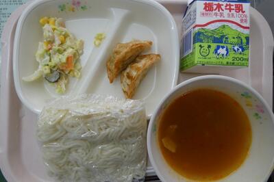 給食は、ぎょうざの甘酢あんかけ、かんぴょうサラダ、ビルマ汁、うどん、牛乳でした。エネルギー605kcal、たんぱく質20.5g、脂質22.3gでした。ごちそうさまでした。