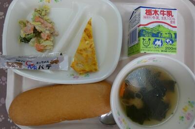 今日の給食は、アンサンブルエッグ、ブロッコリーとツナのサラダ、肉団子と小松菜のスープ、コッペパン、キャラメルパテ、牛乳でした。エネルギー622kcal、たんぱく質23.4g、脂質23.5gでした。ごちそうさまでした。