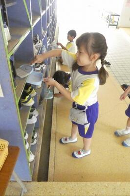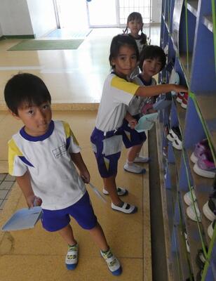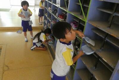 休み時間に、一生懸命に靴箱掃除をしている1年3組の子供たち。
