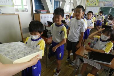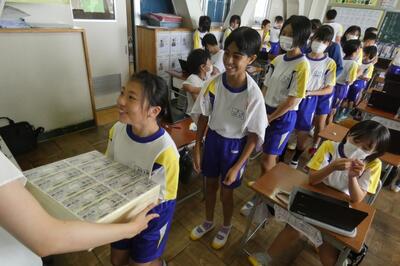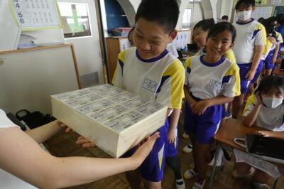 1億円のレプリカを持たせてもらう子供たち。思わず笑みがこぼれるほど重いようです。
