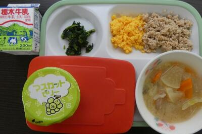 今日の給食は、三色ごはん(とりそぼろ・卵そぼろ・ほうれん草)、豆乳仕立ての野菜汁、マスカットゼリー、牛乳でした。エネルギー655kcal、たんぱく質27.1g、脂質20.3gでした。ごちそうさまでした。