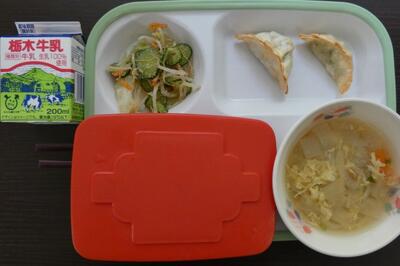 今日の給食は、県産豚肉にら入り餃子、もやしのごま酢あえ、かんぴょうのかきたま汁、ごはん、牛乳でした。エネルギー612kcal、たんぱく質20.8g、脂質17.2gでした。ごちそうさまでした。