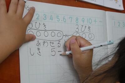学習のまとめをした後、仕上げにもう1問やってみました。答えだけでなく、「あわせると」の状況を、図でも描き表していました。スバラシイ!