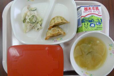 「地産地消週間」最終日です。今日は、ぎょうざの甘酢あんかけ、かんぴょうサラダ、ゆば入りみそ汁、ごはん、牛乳をいただきました。エネルギー655kcal、たんぱく質20.5g、脂質22.6gでした。ごちそうさまでした。