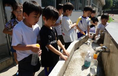 鉢に水をやりながら、子供たちが話しかけてきます。