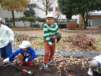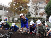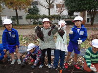 土の中から大きなさつまいもが顔を出すと、大興奮の子供たち。