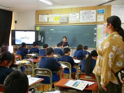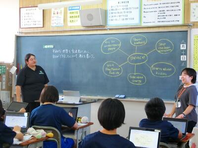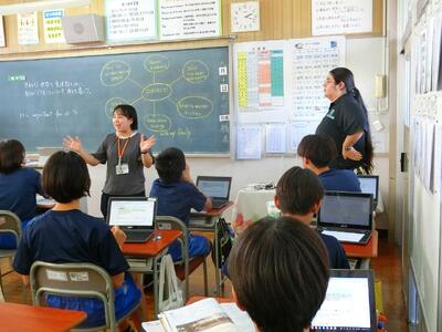 ALTの後に続いて単語の発音を練習したり、ペアで練習したりしています。
