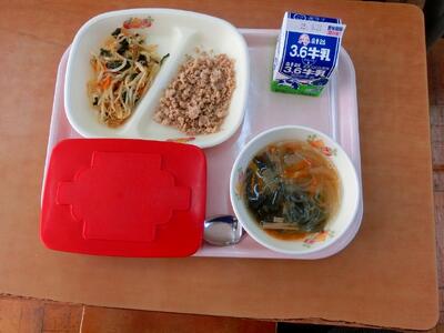 今日の献立は、韓国料理「ビビンバ」の具、わかめと春雨のスープでした。