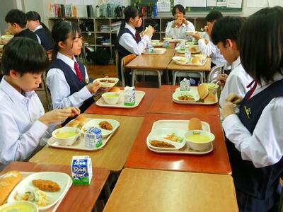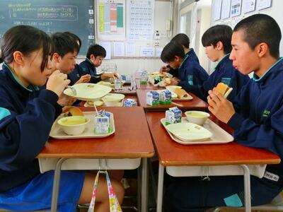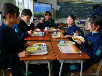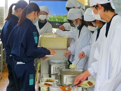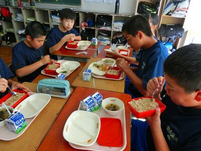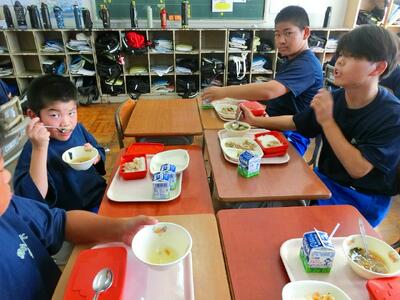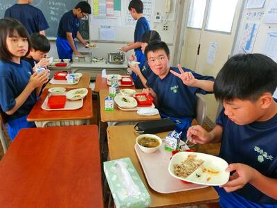 今日の給食は、地産地消の献立の日。どのメニューにも野菜がたっぷり使われていて、栄養たっぷりの献立でした。